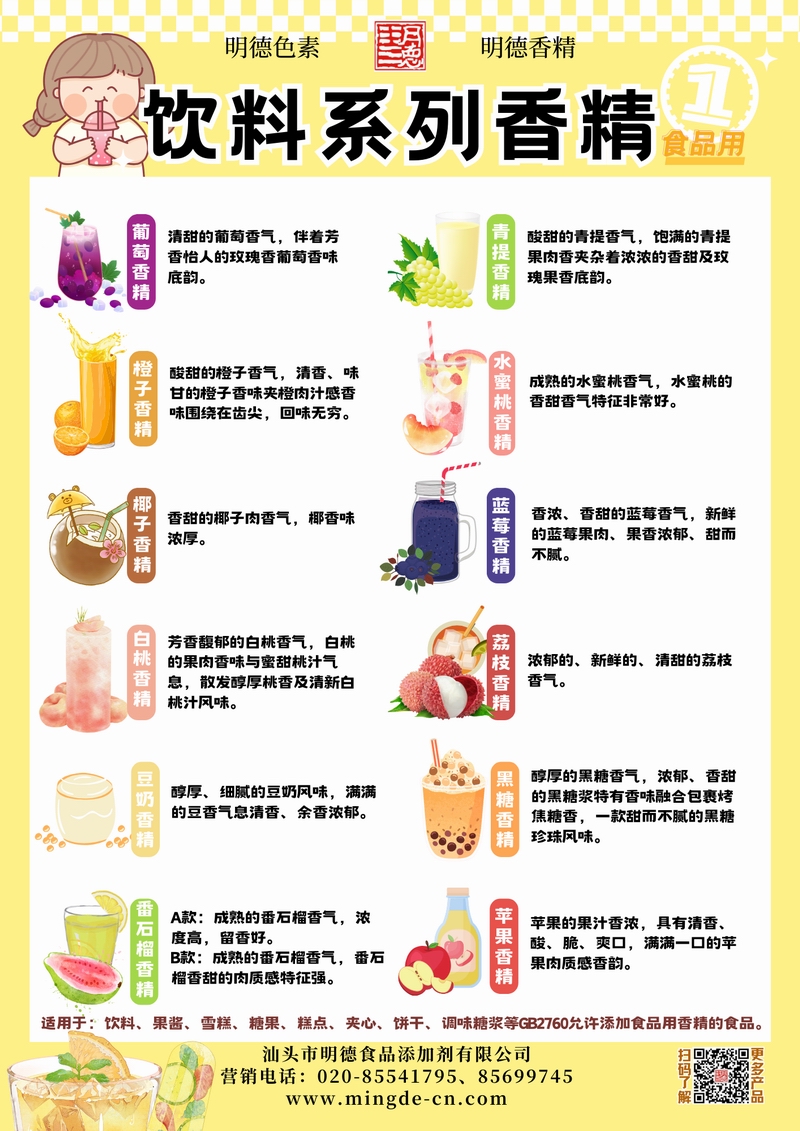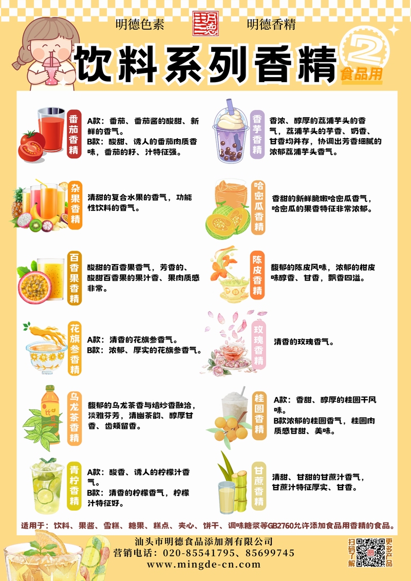 明德飲料系列香精 果香純正 覆蓋多樣飲品場景汕頭市明德食品添加劑有限公司推出的飲料系列香精,涵蓋葡萄、青提、橙子、水蜜桃、椰子、藍(lán)莓、白桃、荔枝、豆奶、黑糖、番石榴、蘋果、青檸、菠蘿、芒果、草莓、檸檬、哈密瓜、百香果、花旗參、玫瑰、雜果、烏龍茶、番茄、香芋、陳皮、桂圓、甘蔗等等多種類目,選擇多樣。產(chǎn)品風(fēng)味真實(shí)、香氣飽滿,適用于飲料、果汁、果醬、糖果、糕點(diǎn)、夾心、調(diào)味糖漿等B端應(yīng)用,幫助工廠快速打造口感豐富、風(fēng)味突出的飲品產(chǎn)品。