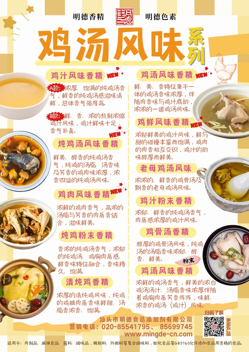 明德雞湯風(fēng)味香精 濃郁鮮香 還原地道雞湯本味汕頭市明德食品添加劑有限公司的雞湯風(fēng)味香精系列,涵蓋雞汁、雞湯、雞鮮風(fēng)味、老母雞湯、雞肉風(fēng)味、雞粉末、雞骨湯、清燉雞等多種品類。產(chǎn)品具備真實的雞肉鮮香、湯香、油香與骨香特征,能夠為醬料、調(diào)味品、肉制品、腌制料及復(fù)合調(diào)味料等B端應(yīng)用提供穩(wěn)定、濃郁的雞湯風(fēng)味解決方案,幫助工廠快速打造風(fēng)味醇厚、回味悠長的雞香產(chǎn)品。